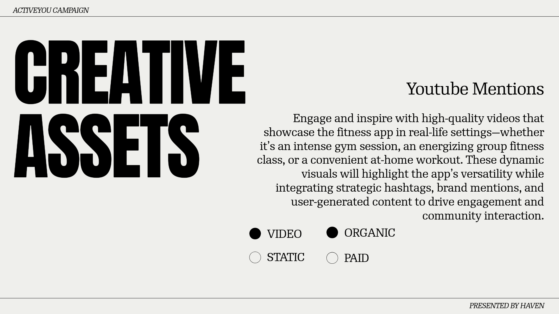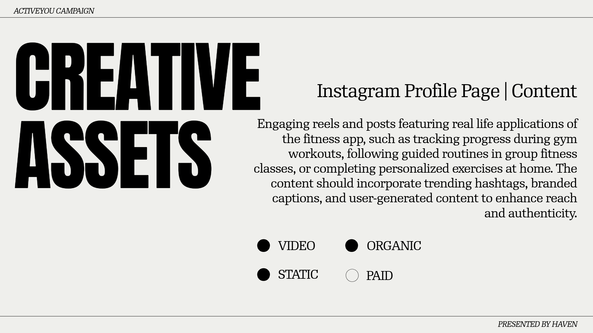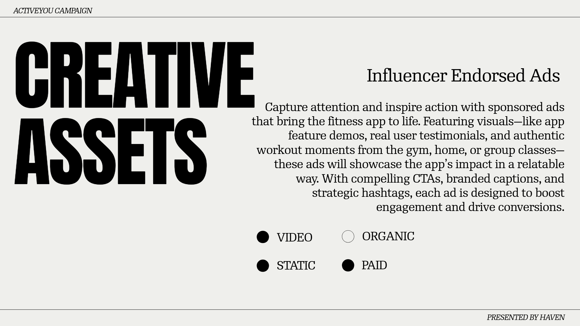 Designed an integrated marketing campaign for ActiveYou, creating assets across paid, owned, and earned media channels. Developed a new logo and crafted a lean brand guide. **following the creation of the ActiveYou marketing strategy**